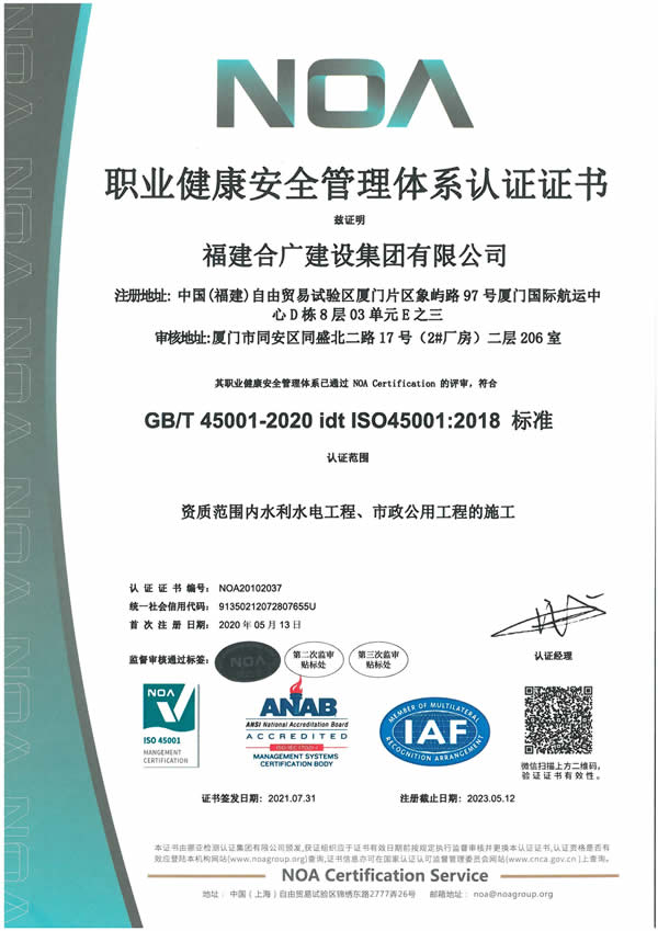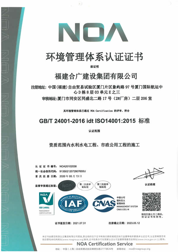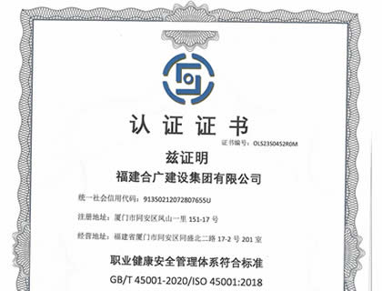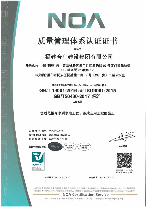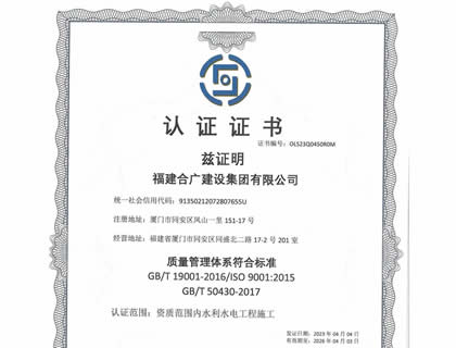 福建合廣建設(shè)集團(tuán)有限公司,注冊資本5188萬元人民幣,公司位于廈門市同安區(qū)鳳山一里151-17號(hào)。本公司成立于2013年,公司具備市政公用工程、水利水電工程、房屋建筑工程、公路工程、園林綠化等多專業(yè)施工資質(zhì)。企業(yè)從業(yè)人員100多人,各類專業(yè)技術(shù)人員70多人,其中高級職稱8人,中級職稱40多人,一級建造師6人,二級建造師15多人。
